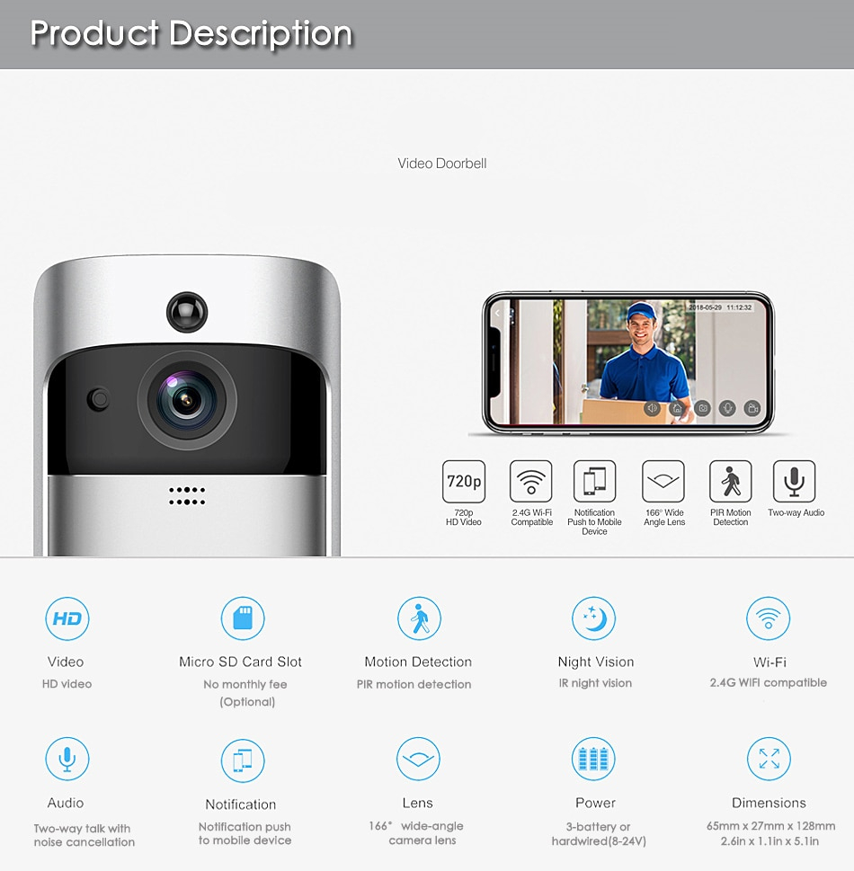 Installed with a 166-degree wide angle lens, provide a clear and wide field of view outside the door.